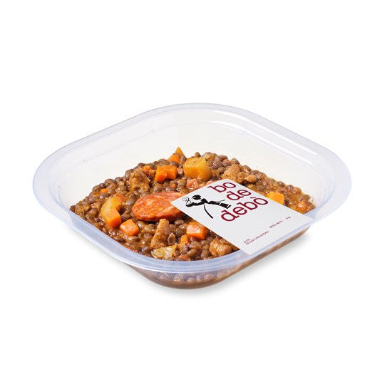 Aigua, llenties (llenties, sal, antioxidant [àcid ascòrbic], conservadors [àcid sòrbic, sorbato potàssic]), patata (patata, antioxidant [àcid ascòrbic]), cap de llom de porc, xoriço (carn i greix de porc, pebre roig, sal, all, orenga), pastanaga, pernil curat (pernil de porc, sal, dextrosa, conservadors [nitrit sòdic, nitrat potàssic]), ceba fregida (ceba, oli d'oliva verge, sal), tomàquet fregit (aigua, tomàquet concentrat, oli refinat de gira-sol, sucre, sal, midó de blat de moro, ceba, all), vi blanc (conté sulfits), brou de pollastre concentrat (sal, aroma, greix de pollastre, greix de cap de bestiar, sucre, maltodextrina, pell de pollastre i carn en pols, concentrat de llimona, acidulantes (àcid cítric, àcid làctic, lactat de calci), antioxidants (extracte de romaní), api de muntanya), gelatina, oli de pinyolada d'oliva, oli refinat de gira-sol, pebre roig dolç, all, julivert.