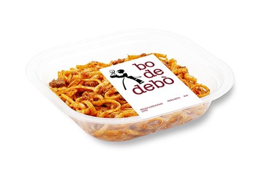 Salsa bolonyesa (53%) (tomàquet fregit [aigua, tomàquet concentrat, oli refinat de gira-sol, sucre, sal, midó de blat de moro, ceba, all], magre de boví [12%], aigua, hortalisses sofregides en proporció variable [pastanaga, porro, api, ceba, oli de pinyolat d'oliva], sal, espècies, conservador [sorbat potàssic]). Tallarines cuites (47%) (aigua, sémola de blat dur, oli de pinyolat d'oliva).