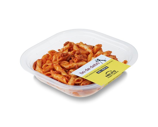 Macarrons cuits (53%) (sèmola de blat dur, aigua, oli de pinyolat d'oliva), salsa estil bolonyesa (47%) (tomàquet fregit [aigua, tomàquet concentrat, oli refinat de gira-sol, sucre, sal, midó de blat de moro, ceba, all], preparat vegetal d'Heura picada [9%] [aigua, texturitzat de farina proteínica de soja (3%), oli d'oliva verge extra, aromes, concentrat (poma, pastanaga, remolatxa i hibisc), sal, antioxidant (àcid ascòrbic), ferro, vitamina B12], aigua, verdures i hortalisses fregides en proporció variable [pastanaga, porro, api, ceba, oli de pinyolat d'oliva], tomàquet concentrat, oli de pinyolat d'oliva, sal, sucre, espècies, conservador [sorbat potàssic]).
