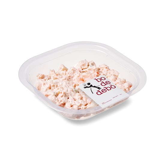Patata (32%), mayonesa [aceite refinado de girasol, agua, huevo y yema de huevo pasteurizados, vinagre de vino, azúcar, sal, estabilizante, (goma xantana), zumo de limón concentrado, conservador (sorbato potásico), aromas], zanahoria (12%), langostino cocido (langostino vammamei (Penaeus Vannamei) (8%) [crustáceos], agua, conservador [metabisulfito sódico (sulfitos)], reguladores de acidez (fosfatos sódicos, trifosfatos, polifosfatos)], salsa rosa (aceite refinado de girasol, puré de tomate, azúcar, yema de huevo, vinagre de vino, sal, almidón modificado de maíz, zumo de limón concentrado, estabilizantes [goma garrofín, goma guar, goma xantana, pectinas], conservador [sorbato potásico], aromas, antioxidante [EDTA]), atún en aceite de girasol (atún listado [pescado], aceite refinado de girasol, sal), surimi (agua, carne de pescado, almidones [contiene gluten], aceite de colza, azúcar, sal, aroma natural[contiene crustáceos, moluscos], colorante [extracto de pimentón]), leche entera UHT, huevo cocido, guisante (2%), conservador (ácido sórbico, sorbato potásico), sal.
