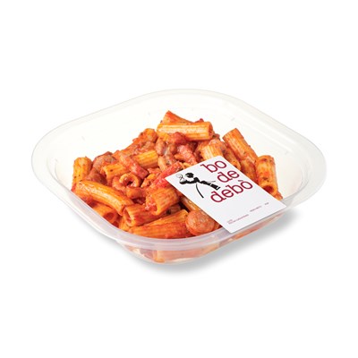 Fideos cocidos (81%) (sémola de trigo duro, caldo de pescado reconstruido [agua, sal, aromas [contienen pescado, crustáceos y moluscos], cebolla, almidón modificado, pescado, extracto de levadura, ajo, aceite de girasol, puerro, camarón boreal, zanahoria, zumo de limón concentrado, patata, concentrado de tomate, estabilizante [goma xantana], colorante [extracto de pimentón], especias]), aceite de orujo de oliva, dados de potón del Pacífico (6%), tomate frito (agua, tomate concentrado, aceite refinado de girasol, azúcar, almidón de maíz, cebolla, ajo), agua, ajo, rejos de pota (8%), pimentón dulce, pimiento verde, cebolla sofrita (cebolla, aceite de oliva virgen, sal), pimiento rojo, sal.